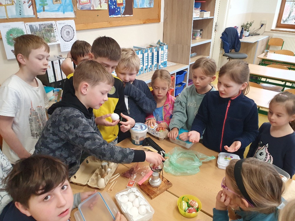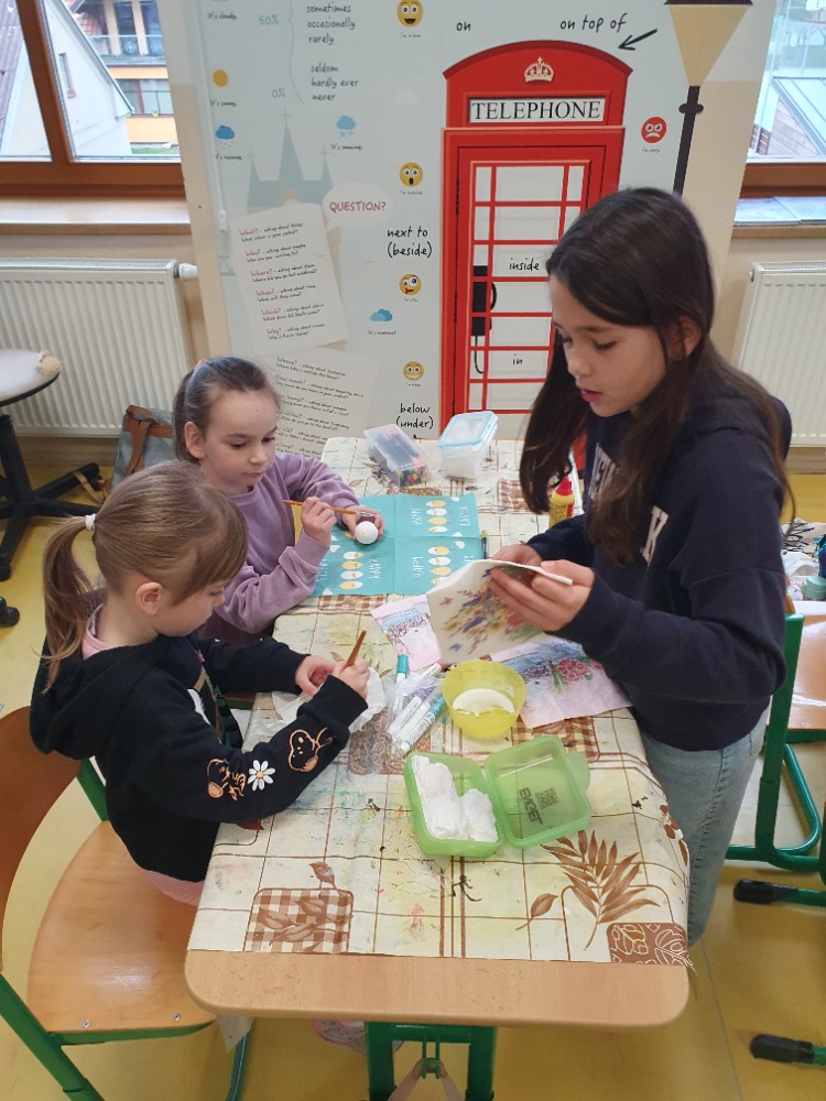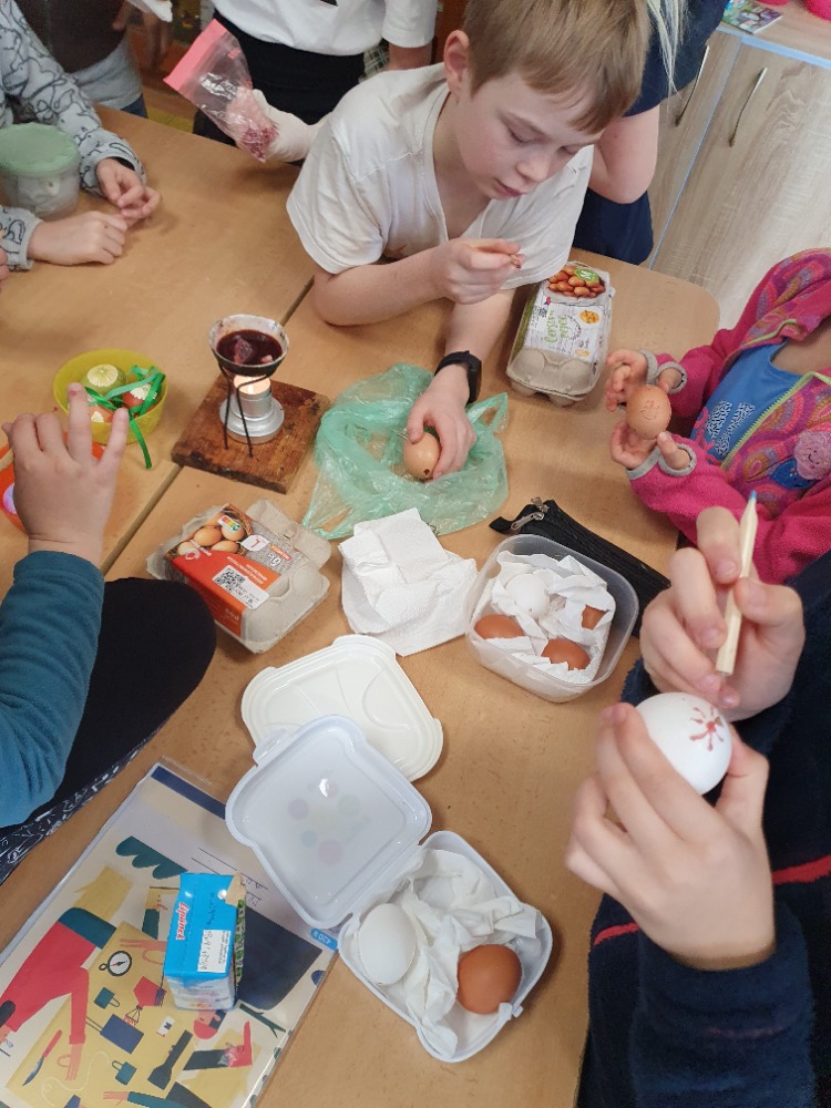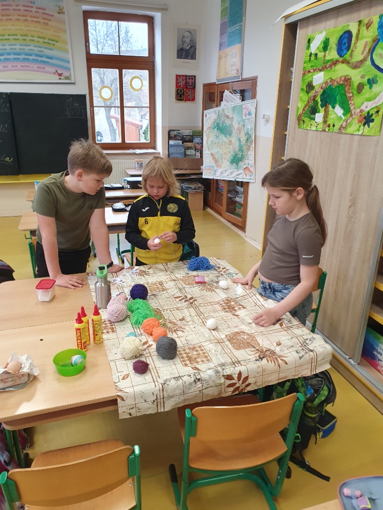 Žáci Školního parlamentu si pro spolužáky připravili 4 stanoviště, na kterých si každý mohl vybrat, jakou technikou chce vyzdobit své vyfouklé vajíčko. Bylo na výběr z malování fixami, ubrouskové techniky, zdobení voskem a zdobení pomocí bavlnek. Nejvíce se o program zasloužili: V.Kroiher, M.John, M.Kupka a M.Oušková. Děkujeme.